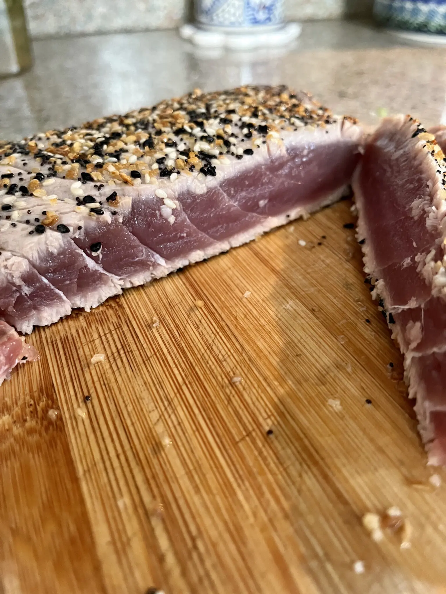 Let the tuna sit on the cutting board to cool for about 5 minutes, then use the sharpest knife you have (or use a knife sharpener) and slice the tuna against the grain (as shown below on the left).