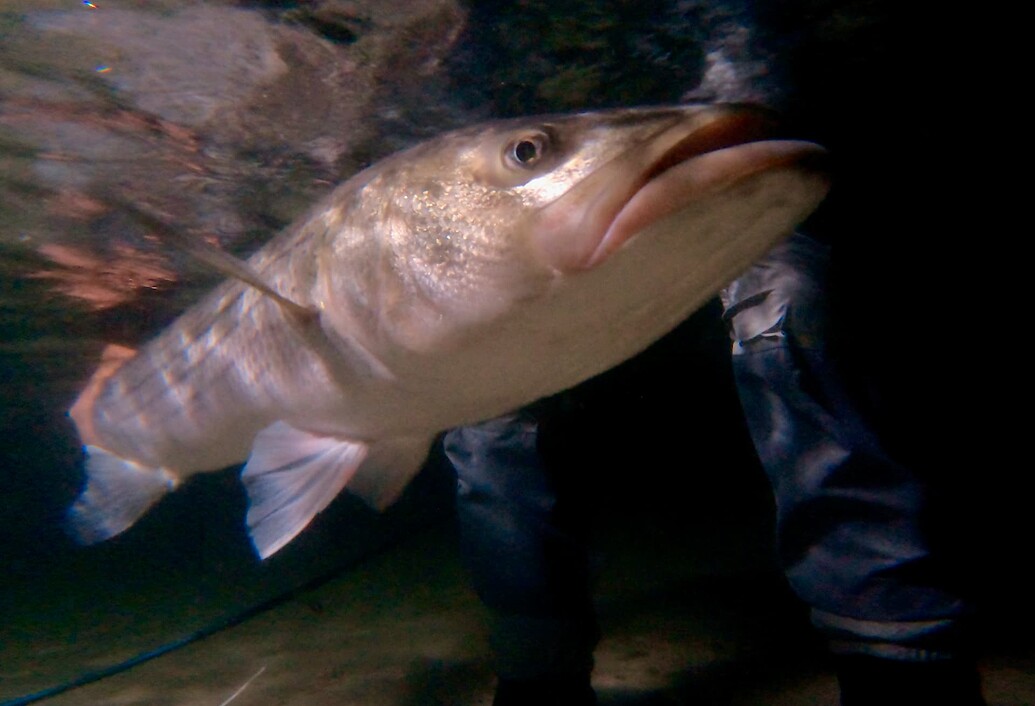 Working the night shift after his day job, Calvin Toran-Sandlin carefully handles a trophy sized bass in June, fully reviving it before sending it back out.