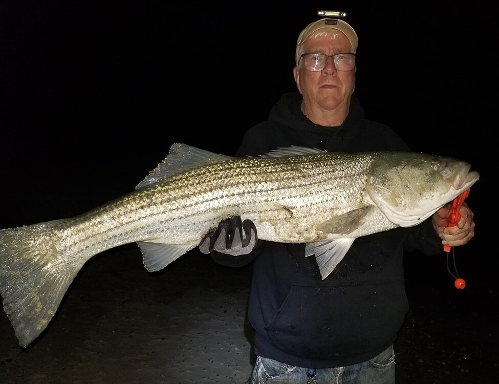 In early October, everything lined up for Mike Markus, pictured with a 45- inch bass caught in the surf. Mike made quick work of getting a picture, then moving fast to get the striper back into the water.